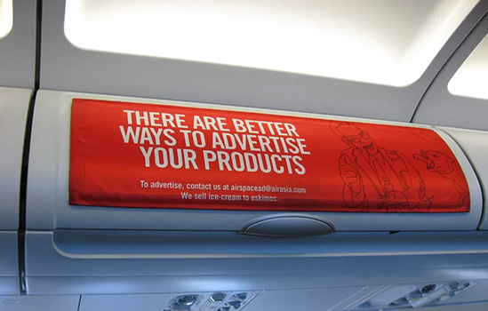 Inflight branding on tray tables and overhead bins for direct passenger engagement.