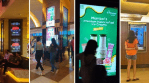High-resolution digital screens placed at mall entrances, food courts, and escalators.